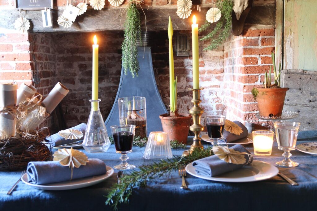This final look combines sophistication with earthiness, blending charcoal-grey linens, copper accents, and fresh citrus for an unforgettable presentation. White plates break up the darker tones, while hammered copper mugs and flatware gleam in the candlelight. The centerpiece a mix of oranges, pomegranates, and cedar, adds fragrance and vibrancy, nodding to the region’s agricultural heritage. Oatmeal-colored linen napkins tie the palette together, softening the contrast. It’s a table that feels modern and rooted all at once, proving that the Southern Christmas spirit is as much about warmth and balance as it is about beauty.