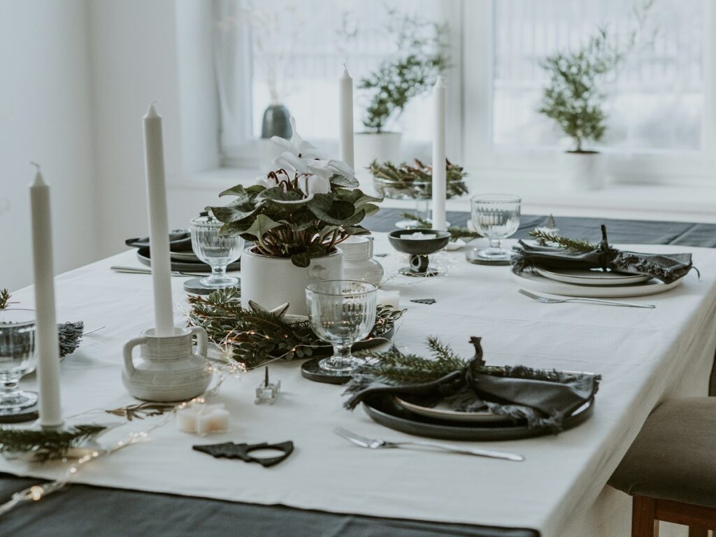 A whitewashed table offers the perfect base for this airy, effortlessly festive look. White stoneware dishes layer neatly atop woven seagrass chargers, creating contrast without clutter. The centerpiece sprigs of evergreen dotted with bright cranberries add both color and scent. Tiny glass votives scattered across the table sparkle just enough to catch attention but never overwhelm. Each napkin, tied with a simple jute string and a fresh cinnamon stick, evokes the rustic warmth of Southern farmhouse gatherings. The beauty here lies in its restraint: fresh, friendly, and festive, without trying too hard to impress.