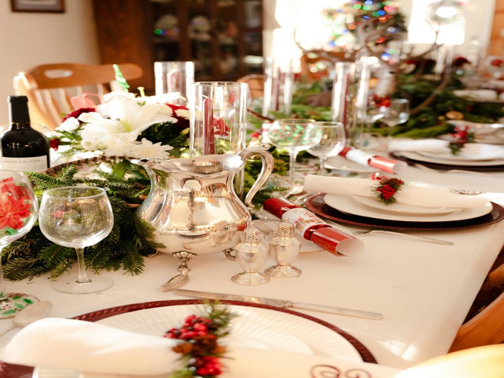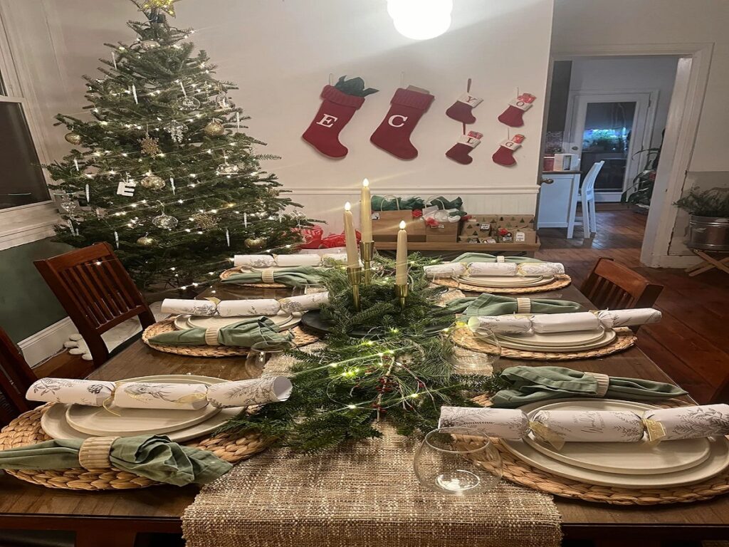 This setting draws from classic Southern greenery, pairing laurel-leaf chargers with white ceramic plates. The result feels lush yet natural, festive without formality. Cranberry-tinted glassware lends a vintage holiday glow, harmonizing with soft sage napkins tied with velvet ribbon. The centerpiece a line of mini wreaths intertwined with pinecones and glowing candles, adds depth and texture. Every element feels thoughtfully chosen but never excessive. It’s the kind of table that invites conversation, reflection, and laughter, an effortless blend of tradition and charm that feels as genuine as Southern hospitality itself.