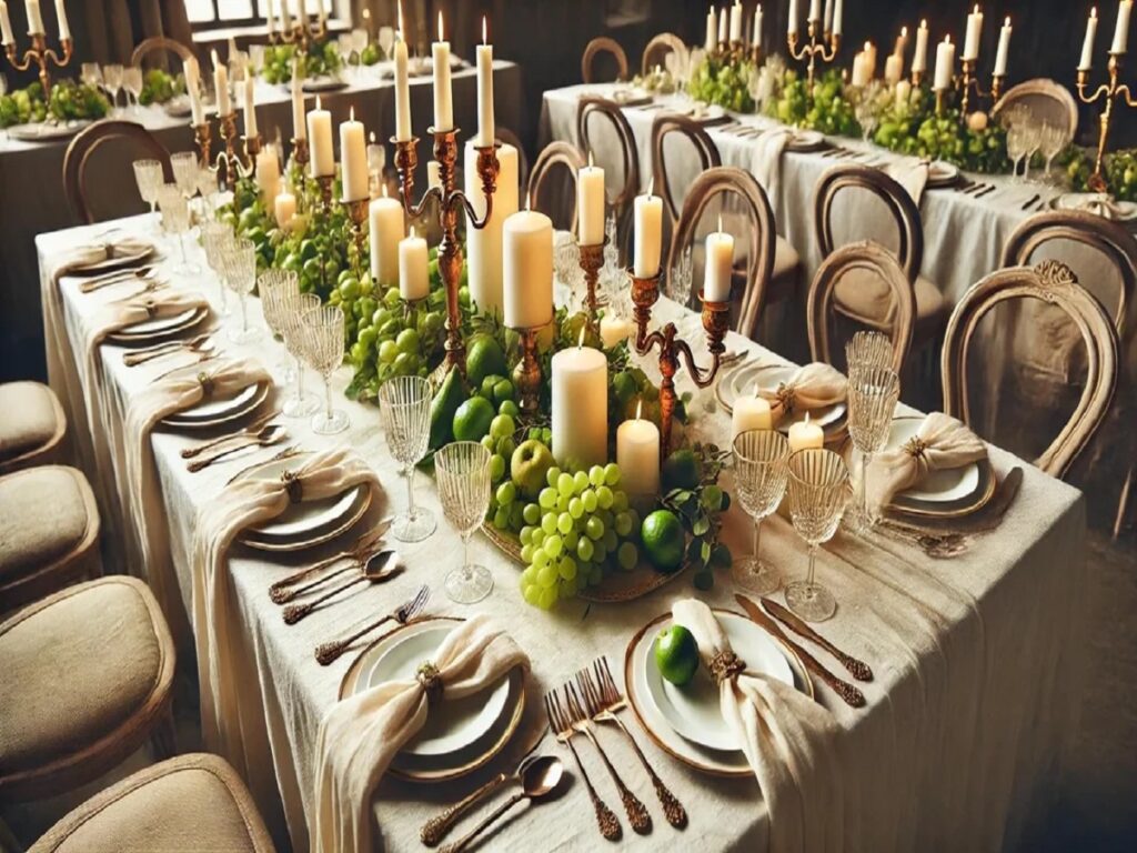 This table proves that simplicity can feel just as inviting as abundance. A crisp white tablecloth sets the stage for understated elegance white plates, clear glassware, and silver cutlery arranged with care. The color story unfolds subtly through kiwi-green napkins tied with soft twine and sprigs of rosemary. Slender taper candles flicker gracefully in plain ceramic holders, lending a tranquil rhythm to the table. This minimalist design reflects modern Southern sensibilities: clean lines, thoughtful restraint, and natural beauty. It’s ideal for slow, lingering lunches or intimate candlelit dinners that focus on connection over decoration.
