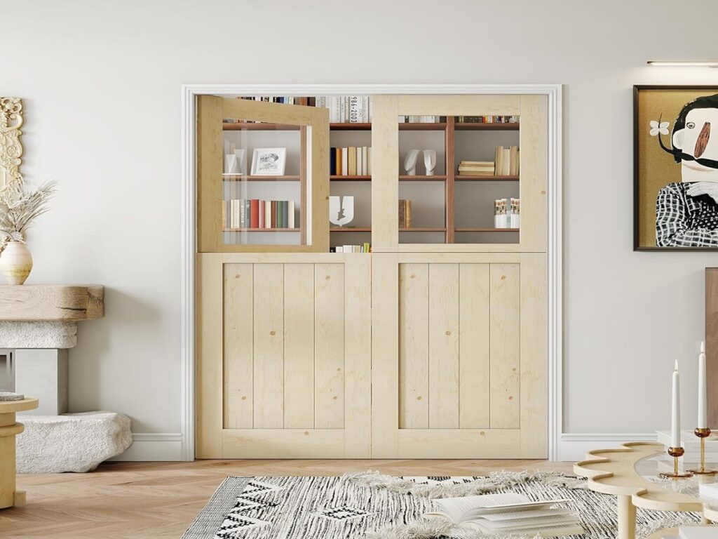 Dutch doors, which originated in 17th-century Europe, divide horizontally, allowing the top half to open while the bottom remains closed. Bringing that design to a pantry creates a charming and functional twist. You can peek in or pass items through without opening the full door. Painted in bright hues or classic wood stains, Dutch pantry doors lend a touch of whimsy and old-world appeal, perfect for families who appreciate both nostalgia and practicality.