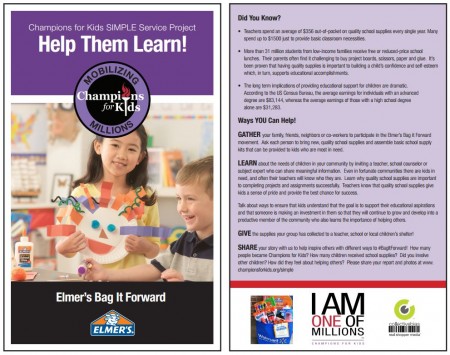 With the economy still in “recovery” (regardless of what some people say) we often hear about some of the struggles our local schools deal with. Not only do we hear about teachers who have to spend their own money for classroom supplies, but there are many kids who families can’t always provided all of the school supplies on that yearly listed. Fortunately, there are programs, such a Champions for Kids, that work to help improve the lives of children across the US. This month, Elmer’s is sponsoring the “Bag It Forward” Simple Service Project. The goal – to provide quality school supplies to kids who are in need.