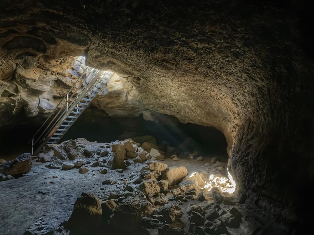 Tucked in Oregon’s high desert, Derrick Cave stretches about 1,134 feet long with wide, arched ceilings reaching nearly 46 feet high. Formed between 6,800 and 13,000 years ago, it was once used by early settlers for storage and even as a Cold War fallout shelter. The entrance, a dramatic skylight opening, leads to branching lava corridors scattered with cooled rock drips. Despite its remote location, Derrick Cave rewards explorers with solitude, silence, and a raw connection to Oregon’s volcanic soul.